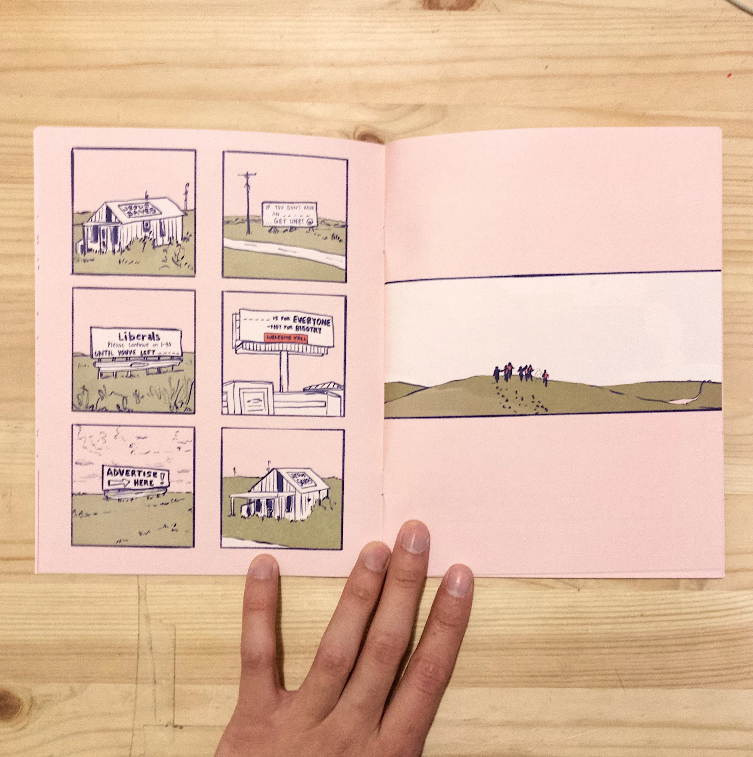 Midday Cowboy takes its inspiration from the film Midnight Cowboy and places familiar figures and settings in new arrangements to form ever-changing and novel narratives. It’s a comic about searching for something familiar but ultimately just settling for something else.